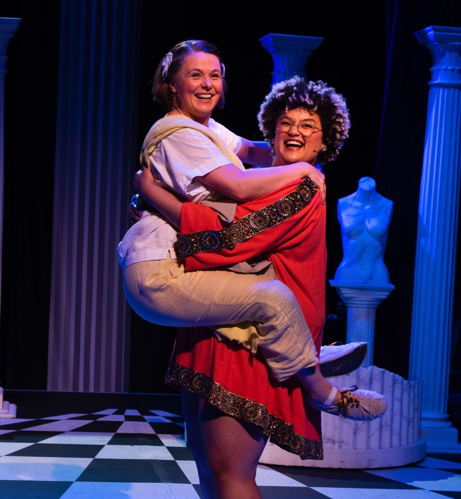 The plot is too ridiculous to explain at length, so I won’t try. What you need to know, though, is that there are a lot of laughs in this production of “A Funny Thing”. Despite a small production budget and a stripped-back ensemble, the female-led cast works hard to make everything work. Sure, there are times when the script, littered with roles for men, cries out for some muscles, chest hair, and boyish features on stage. Most notably in the second act when Sondheim’s songs take a backseat to the script and plot twists… and the Romans start to feel frisky under their togas. If you catch my drift! 😜